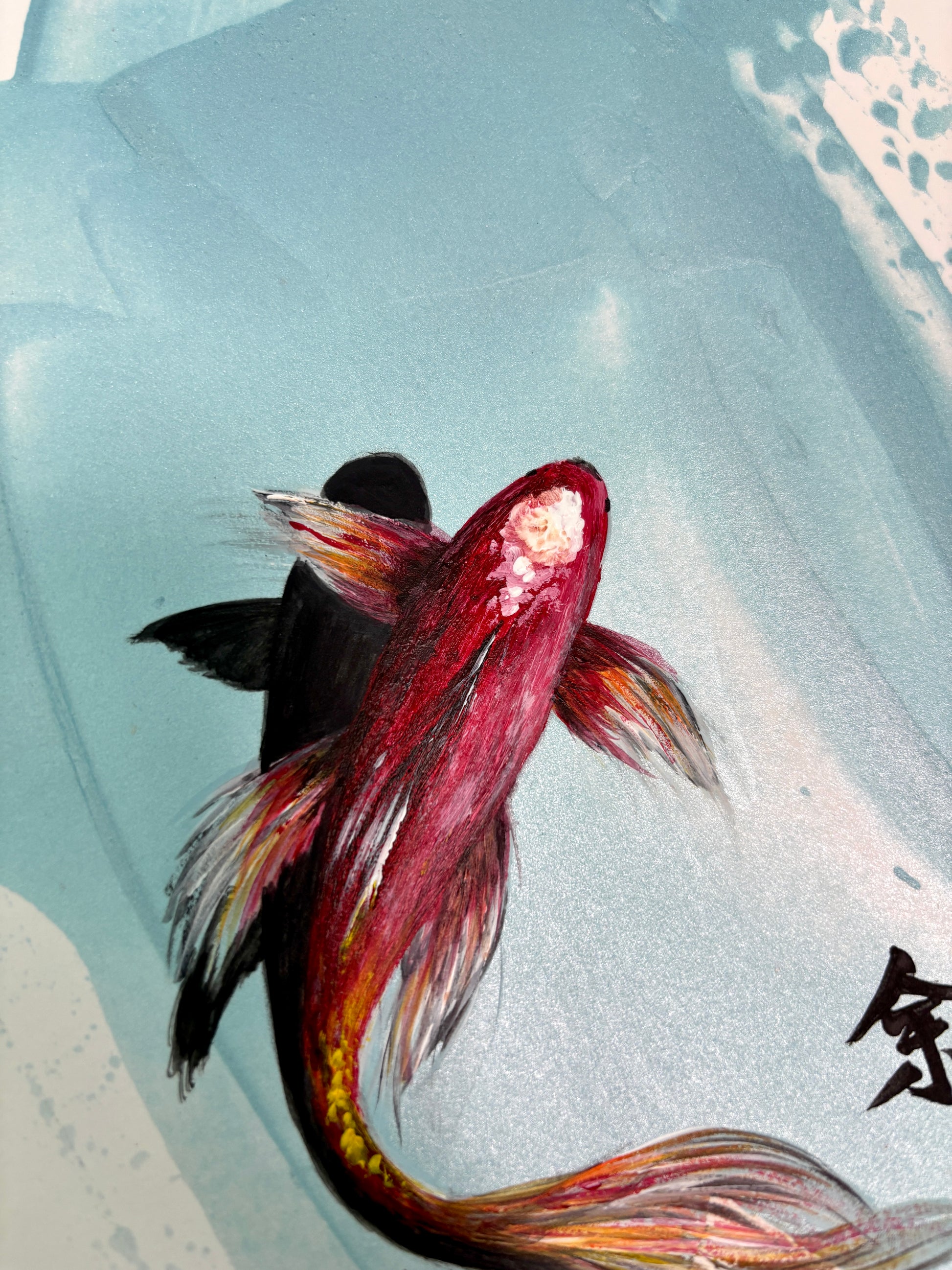 An elegant red koi glides effortlessly through a shimmering blue expanse, its vibrant form standing in striking contrast against the tranquil backdrop.