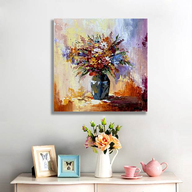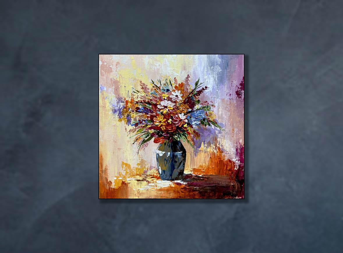 This art piece bursts with warm hues, signifying the optimism that comes along with spring. Using thicker paints, this piece is lightly textured (as shown in attached video). This lovely piece comes with a white floating frame.