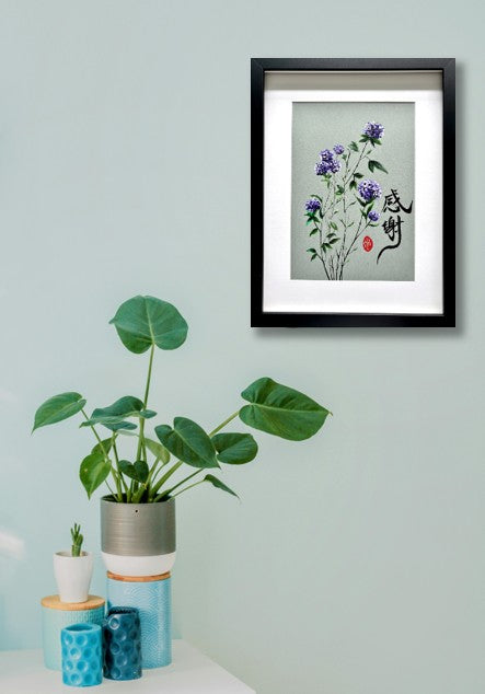This piece blends tradition with modern artistry — a calligraphy of the Chinese character “感谢”, meaning gratitude, rendered in fluid, expressive strokes. Surrounding it are purple hydrangeas, symbolising appreciation and heartfelt thanks. A graceful composition that celebrates the beauty of gratitude and the connections that enrich our lives.