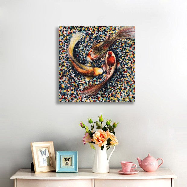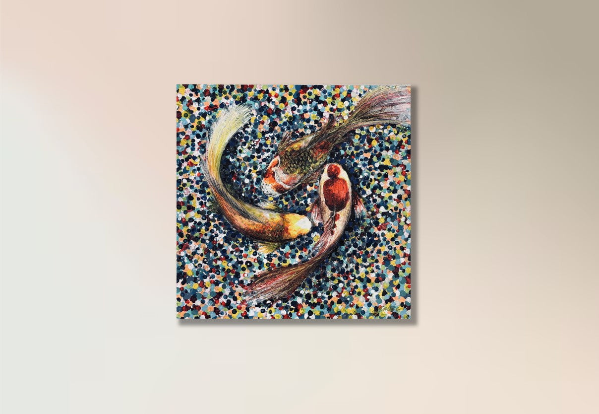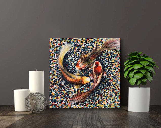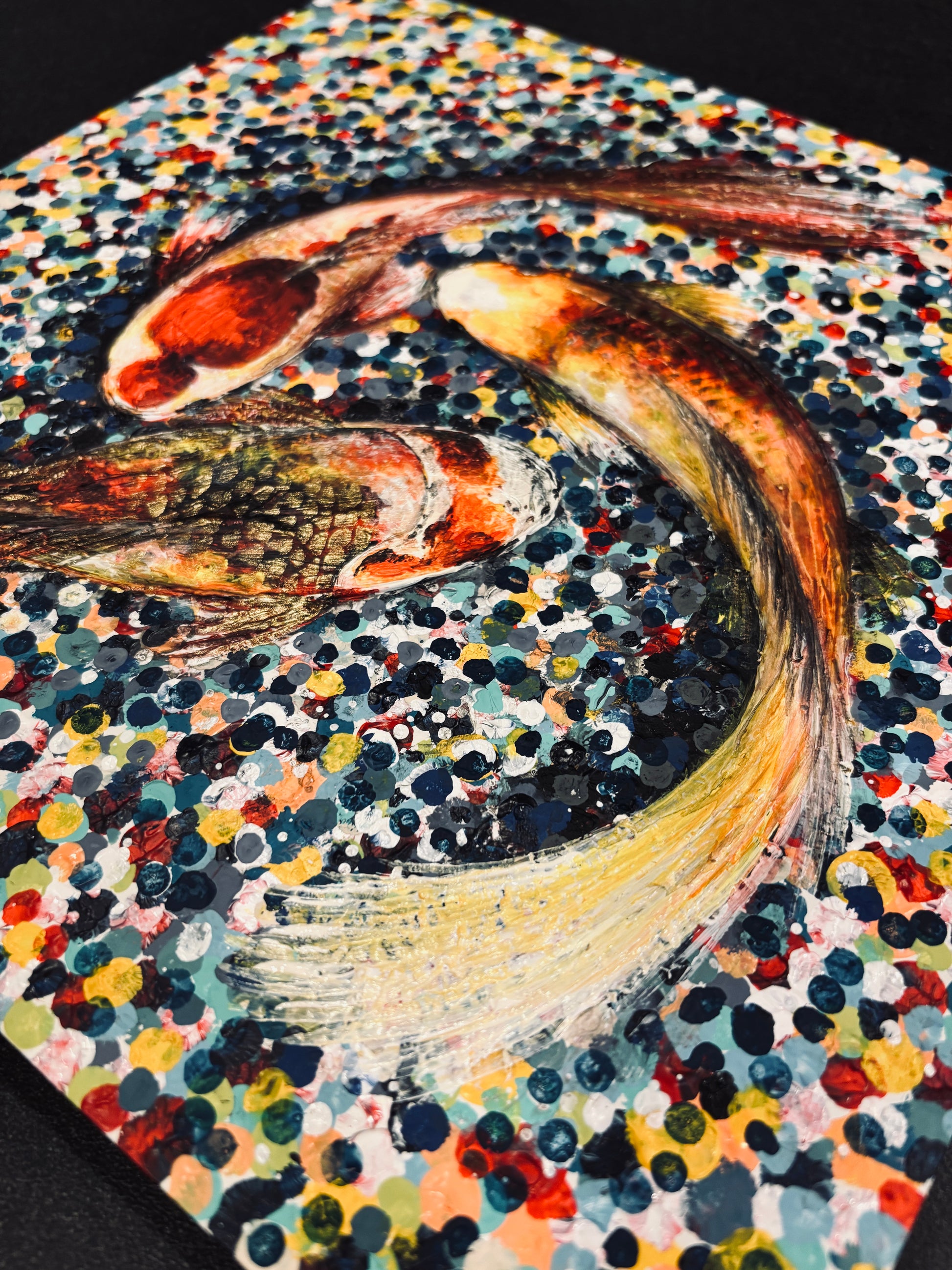 This art piece captures three koi gliding gracefully through a sea of confetti-coloured mosaics, weaving nature and art into a mesmerizing dance.