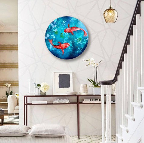 A round canvas capturing two graceful koi gliding in harmony through serene blue waters.