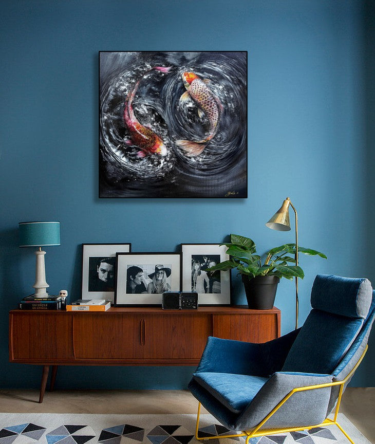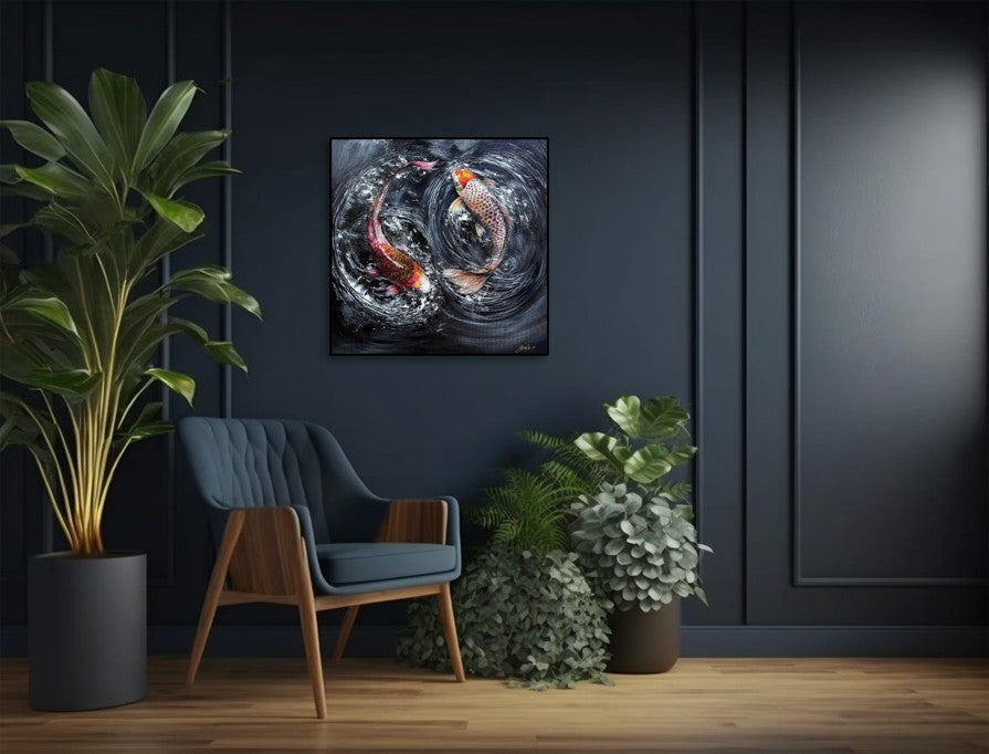 This piece features two koi gliding through mysterious waters, their gentle movements stirring ripples that shimmer like time itself. The dark waters carry both memory and mystery — much like the journey of two souls weathering challenges, embracing change, and moving forward in harmony.